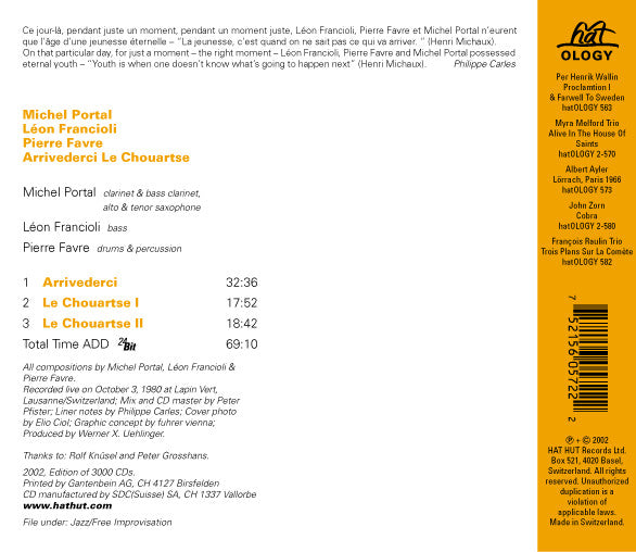 MICHEL PORTAL - LEON FRANCIOLI - PIERRE FAVRE - ARRIVEDERCI LE CHOUARTSE - HATOLOGY - 572 CD